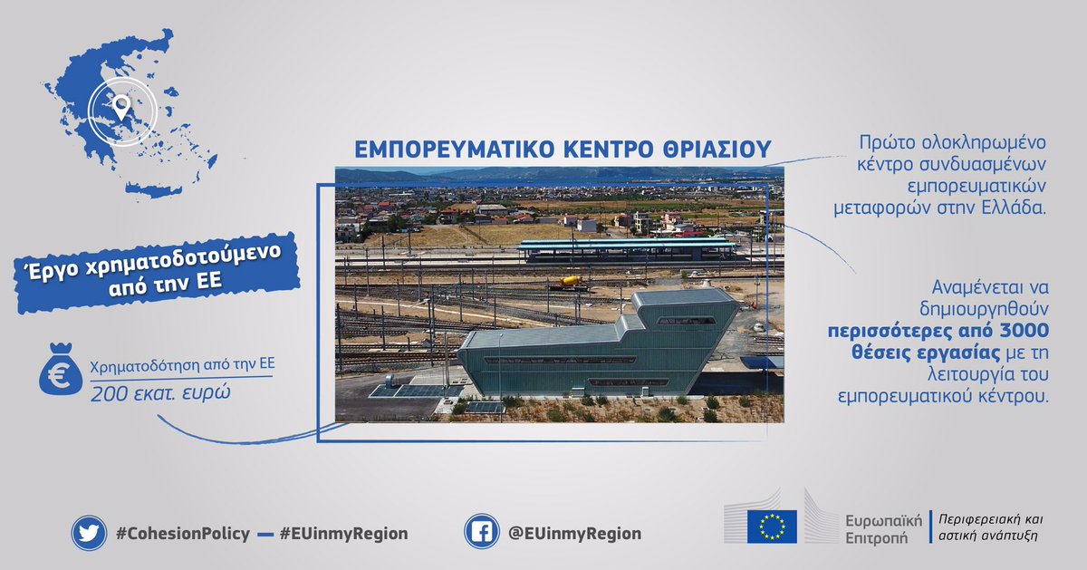 Το έργο του Θριασίου Πεδίου, που αποτελεί τον πρώτο ολοκληρωμένο σταθμό εμπορευματικών και σιδηροδρομικών δραστηριοτήτων στην Ελλάδα, χρηματοδοτείται από την Ευρωπαϊκή Επιτροπή, ενώ για τη δημιουργία του έχουν χορηγηθεί 200 εκατ. ευρώ από κονδύλια της ΕΕ.